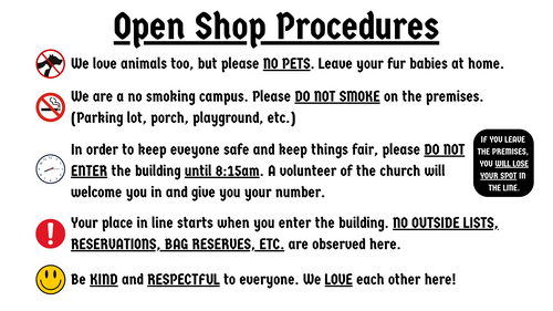 Every Friday, we invite those in the community suffering from food insecurity to shop in our pantry. With the generosity of Food Lion, Walmart, Dollar General, Second Harvest, and the USDA, we are able to stock our pantry with varities of meats, dairy, produce, breads, sweets, and more!